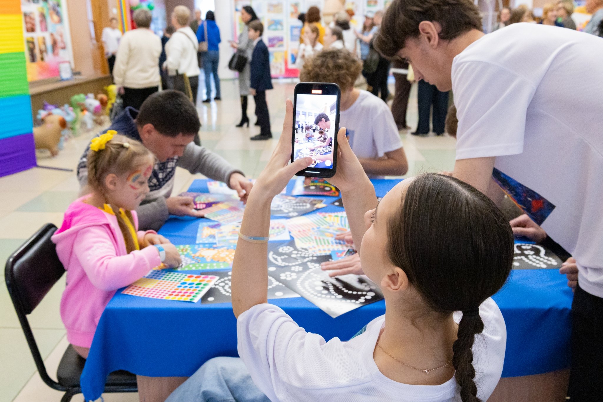 Пространство фойе ГДК стало большой творческой мастерской. Гости знакомились с выставкой детских работ "Я так вижу" (0+), где каждый рисунок и поделка отражали уникальное восприятие мира. На мастер-классах (0+) дети и взрослые вместе учились создавать свечи из вощины, осваивали декоративную мозаику и технику аквагрима.