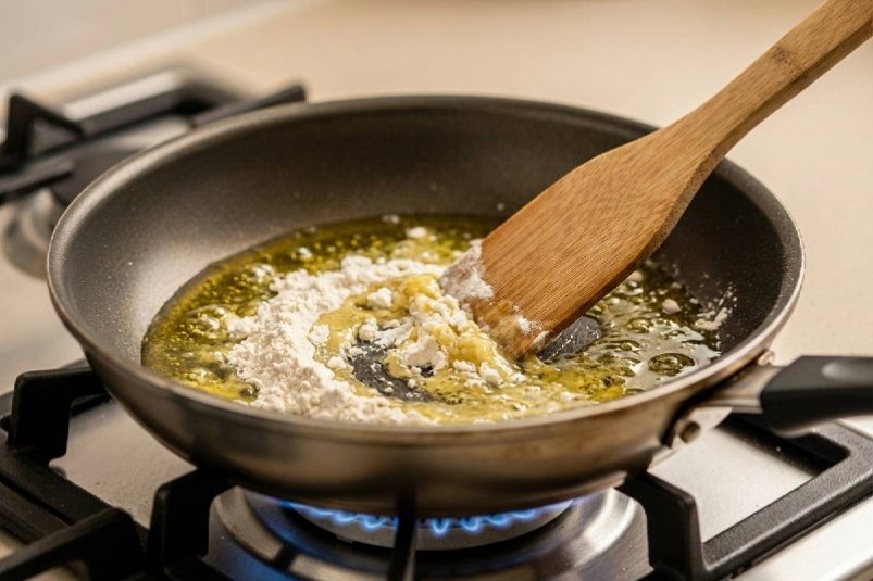 2. Когда масло хорошо разогреется, начинайте понемногу всыпать муку, постоянно помешивая.