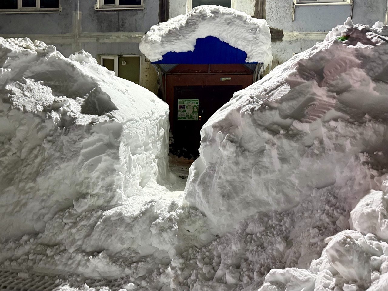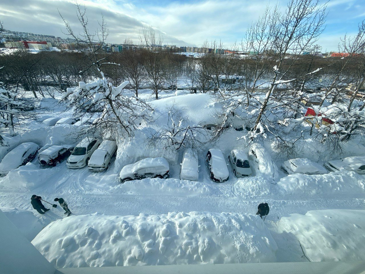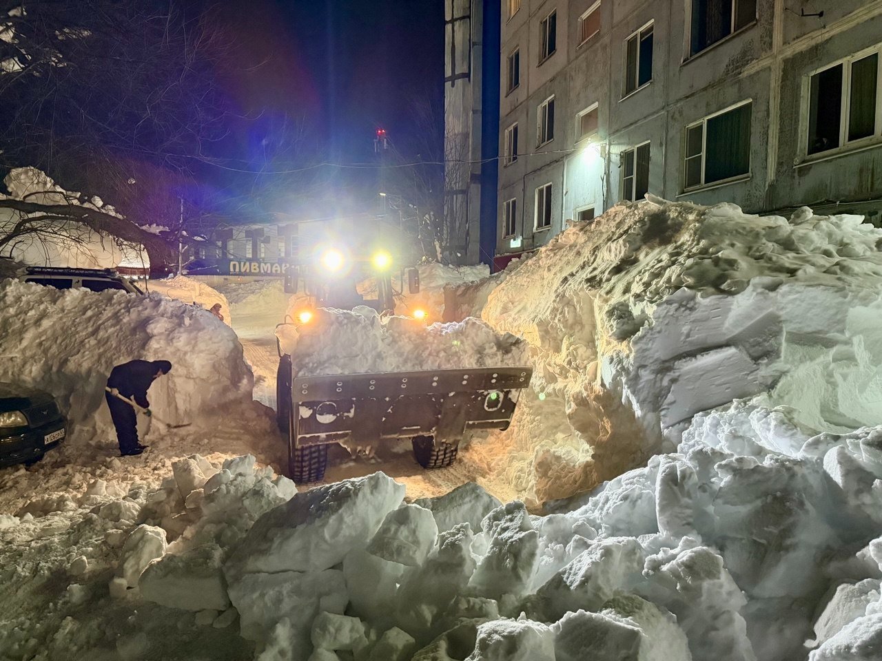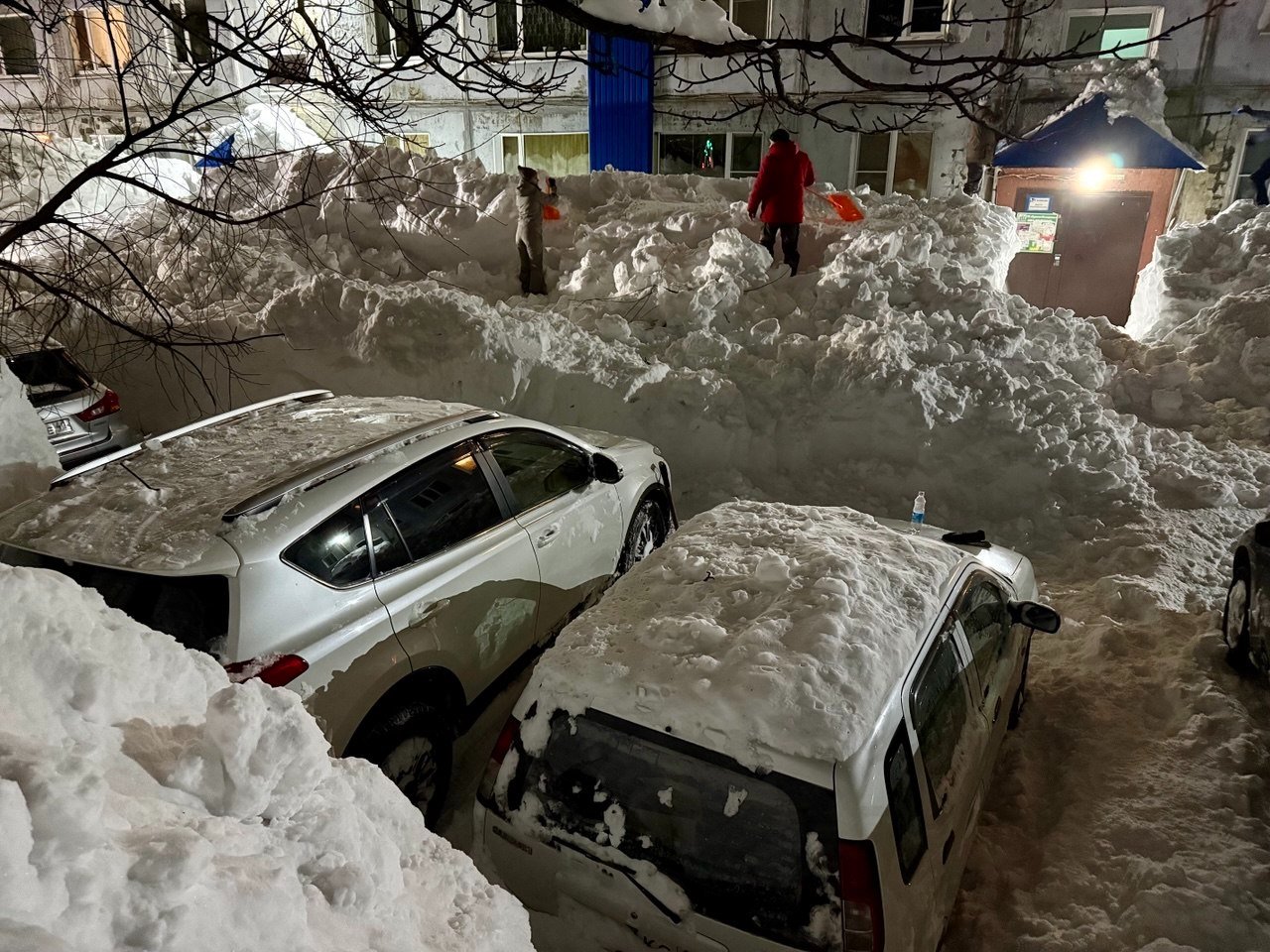 Обычный двор в Петропавловске-Камчатском. Последний раз снег убирали в середине декабря. После всех циклонов проезд полностью заблокирован уже две недели. Невозможно вывезти мусор, проехать пожарным и скорой, подвести товары в окрестные магазины. Попытка погрузчика пробиться в соседний двор закончилась крахом — спецтехника чуть не свалилась в яму со свежеоткопанным автомобилем, а потом превратила въезд в площадку для могула с трамплинами и ухабами.
