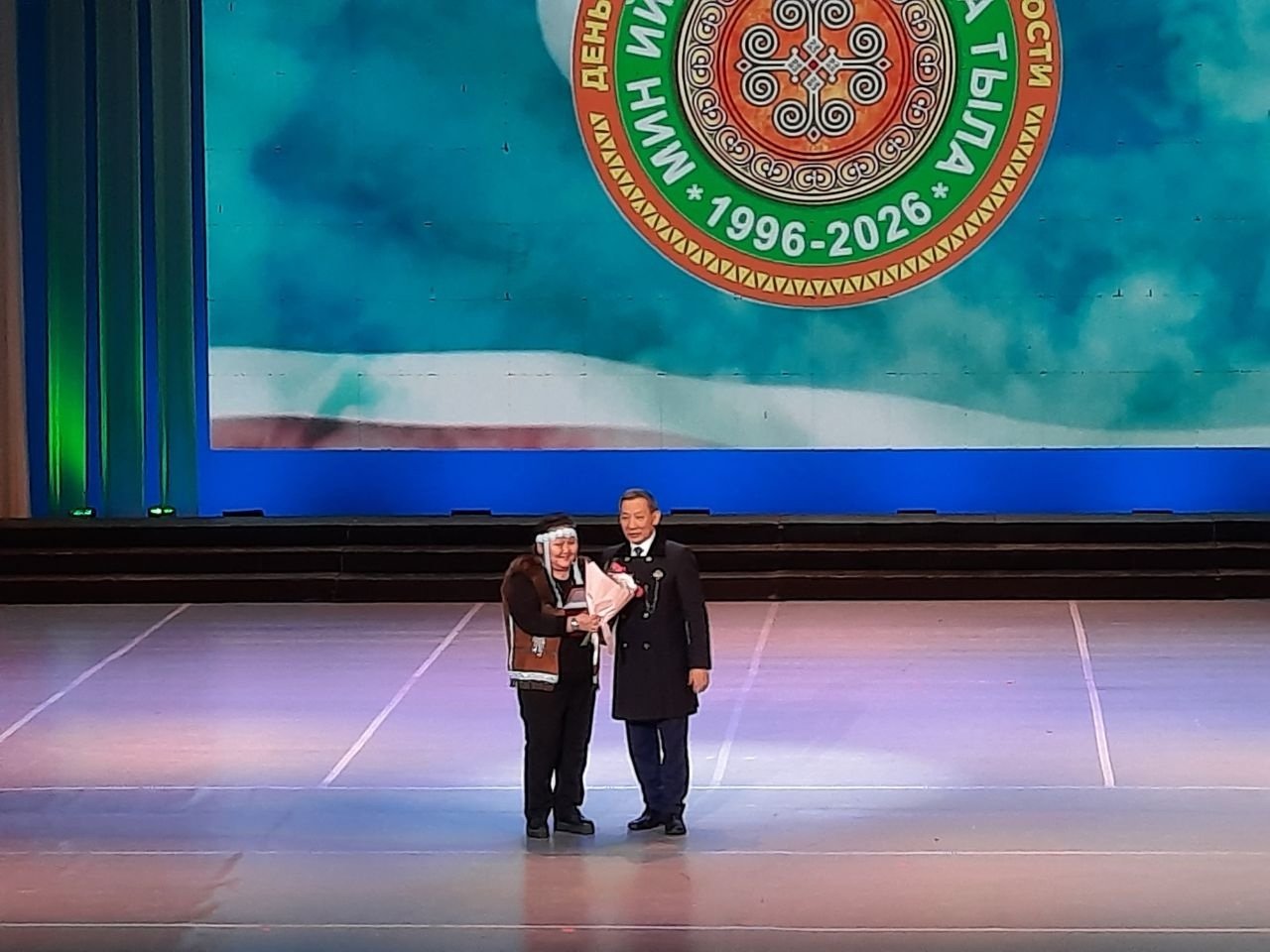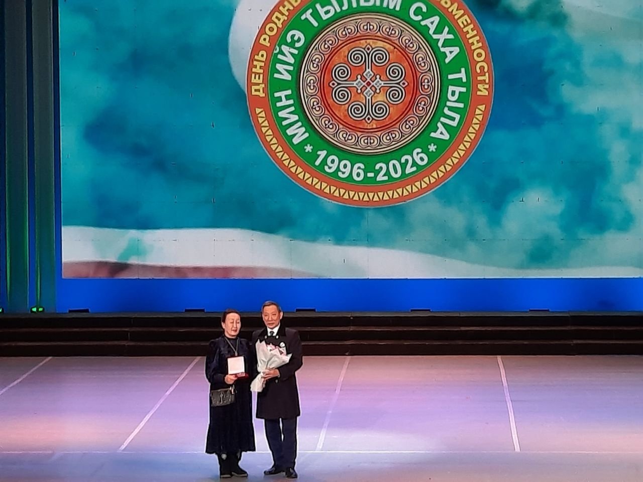 С поздравлением к аудитории обратился и министр культуры и духовного развития Афанасий Ноев. Он вручил почетный знак "За вклад в сохранение и развитие родных языков в Республике Саха (Якутия)" Галине Поповой — Санаайе и Фене Лихановой.