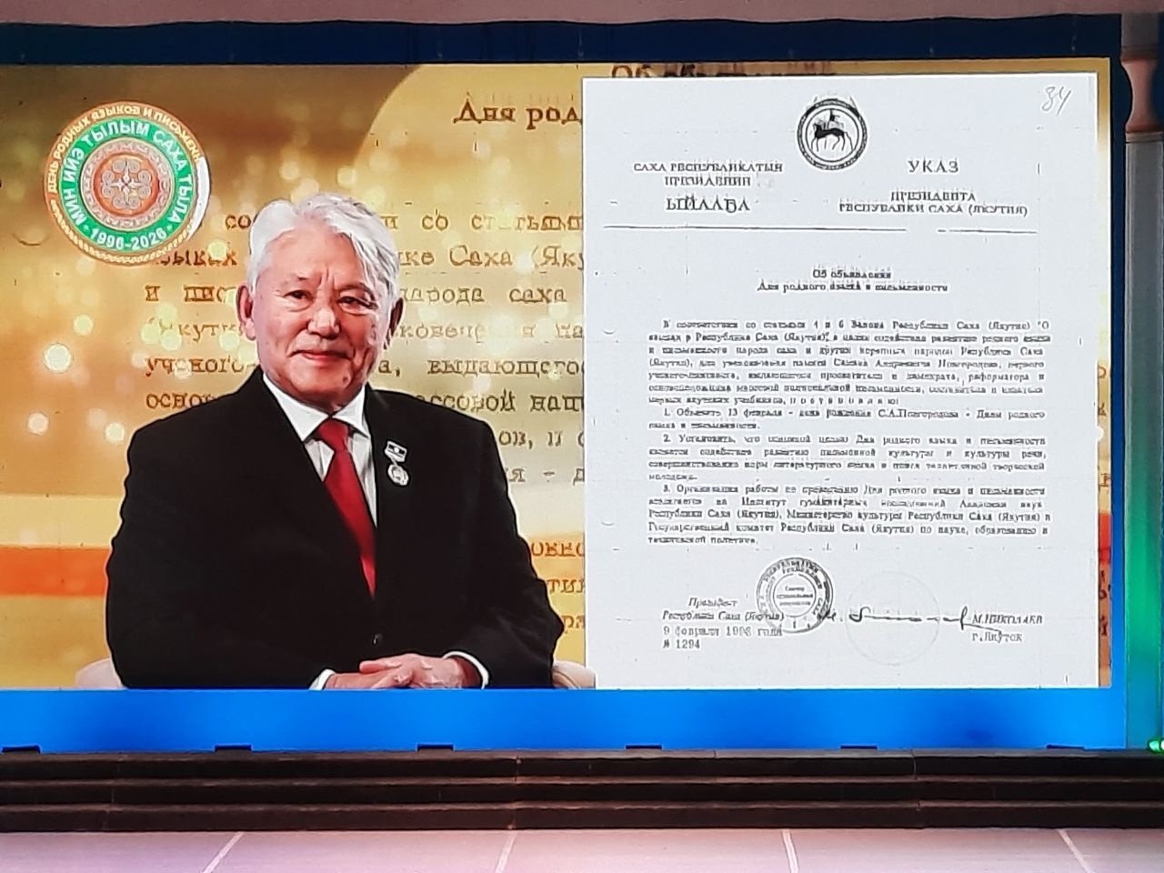 Торжественная церемония (12+), приуроченная ко Дню родного языка и письменности, прошла в Государственном театре оперы и балета имени Д.К. Сивцева — Суоруна Омоллоона. В ее рамках были присуждены премии Ил Дархана, отмечающие заслуги в деле сохранения, исследования и продвижения языков народов республики. Мероприятие проводится в рамках объявленного в Якутии Года культуры и всероссийского Года единства народов, который был провозглашен Президентом России Владимиром Путиным. Более подробно в фоторепортаже ИА YakutiaMedia.