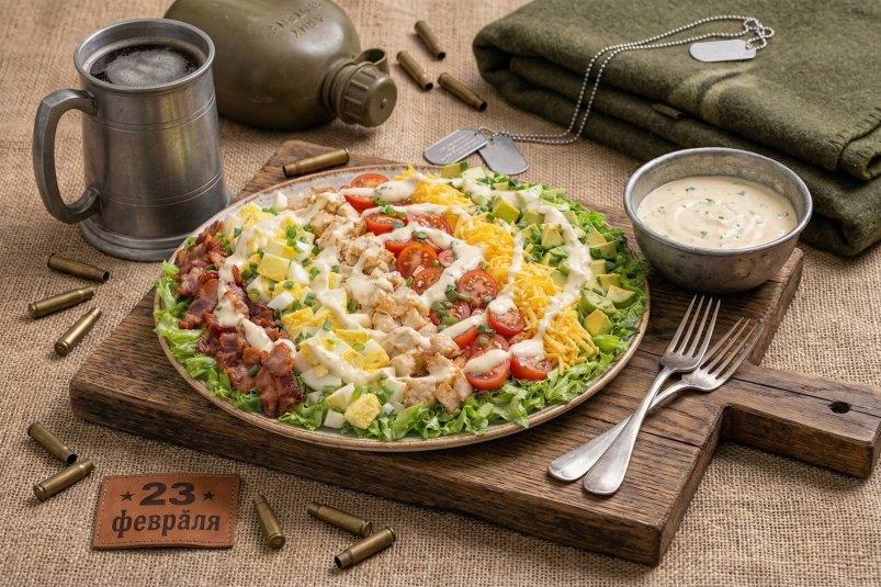 Салат "Супермен" — удачный вариант праздничного салата к 23 Февраля. Он сытный, яркий и смотрится на столе как полноценное угощение для мужчин. Рецепт напоминает классический салат "Кобб", но адаптирован под более насыщенный вкус. В составе курица, хрустящий бекон, яйца, авокадо, сыр и пикантная заправка.