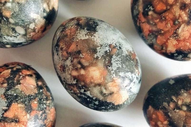 Эффектные мраморные яйца легко приготовить в домашних условиях. Рисунок на каждом получается уникальным и выглядит празднично.