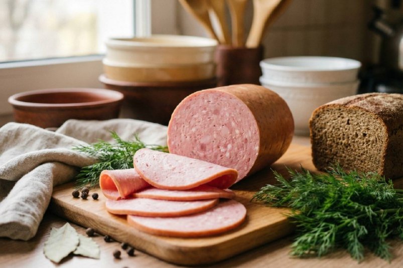 Убрать форму в холодильник и оставить на ночь. На следующий день колбаса полностью застынет и будет готова к нарезке.