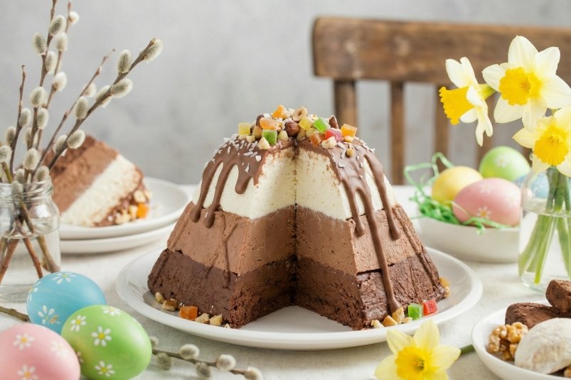 Творожная пасха с тремя шоколадными слоями превращается в центральное украшение праздничного стола. Её структура нежная, как облако, а вкус напоминает десерт из лучших кондитерских. В составе нет сырых яиц и крахмала, а готовится она легко и быстро.