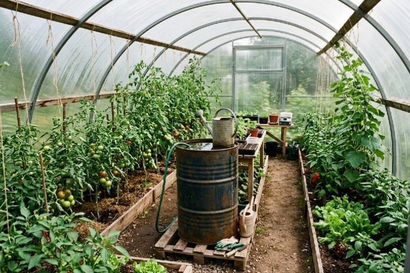 Многие владельцы теплиц замечают, что опытные огородники ставят внутри бочку с водой, при этом не используют её для полива. На самом деле этот приём выполняет несколько важных функций и заметно улучшает условия для растений.