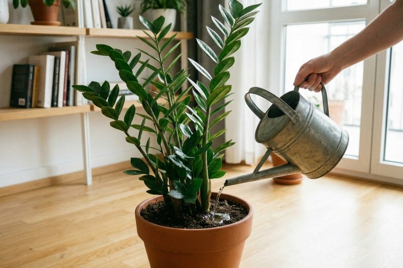 Для чередования можно использовать раствор кальциевой селитры — 2 г вещества на 1 литр воды. Такой состав усиливает рост молодых побегов и повышает плотность тканей. После полива замиокулькас оживает буквально на глазах.