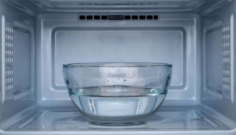В глубокую миску налейте воду, добавьте уксус (9%), лимонную кислоту и тщательно перемешайте жидкость ложкой. Поставьте миску в микроволновку, включите прибор на максимальную мощность и установите таймер на 1 минуту.