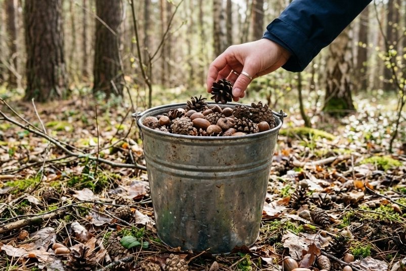 Для урожайного сезона хватит мешка шишек и желудей. Эти природные материалы делают землю плодороднее, растения крепче, а участок аккуратным.