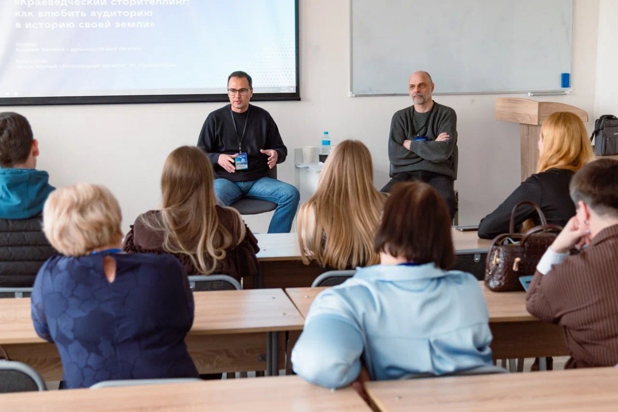 EAOMedia, 12 апреля. Почему местная история часто кажется людям скучной и как превратить её в живой увлекательный рассказ? Творческая встреча с дальневосточным писателем Василием Авченко "Краеведческий сторителлинг: как влюбить аудиторию в историю своей земли" состоялась в рамках ДВ МедиаСаммита (12+) в Биробиджане. Модератором мероприятия выступил региональный директор ИА PrimaMedia (18+) Игорь Чёрный.