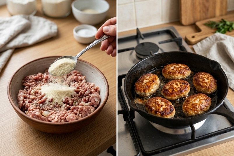 Ещё один полезный совет: перед жаркой обваляйте котлеты не в муке, а в панировочных сухарях. Они создают аппетитную корочку, которая удерживает соки внутри и делает вкус более насыщенным.
