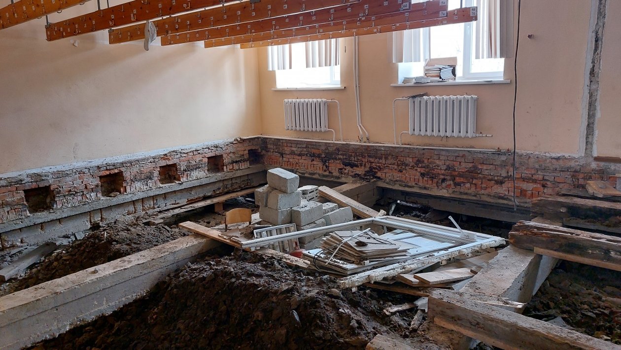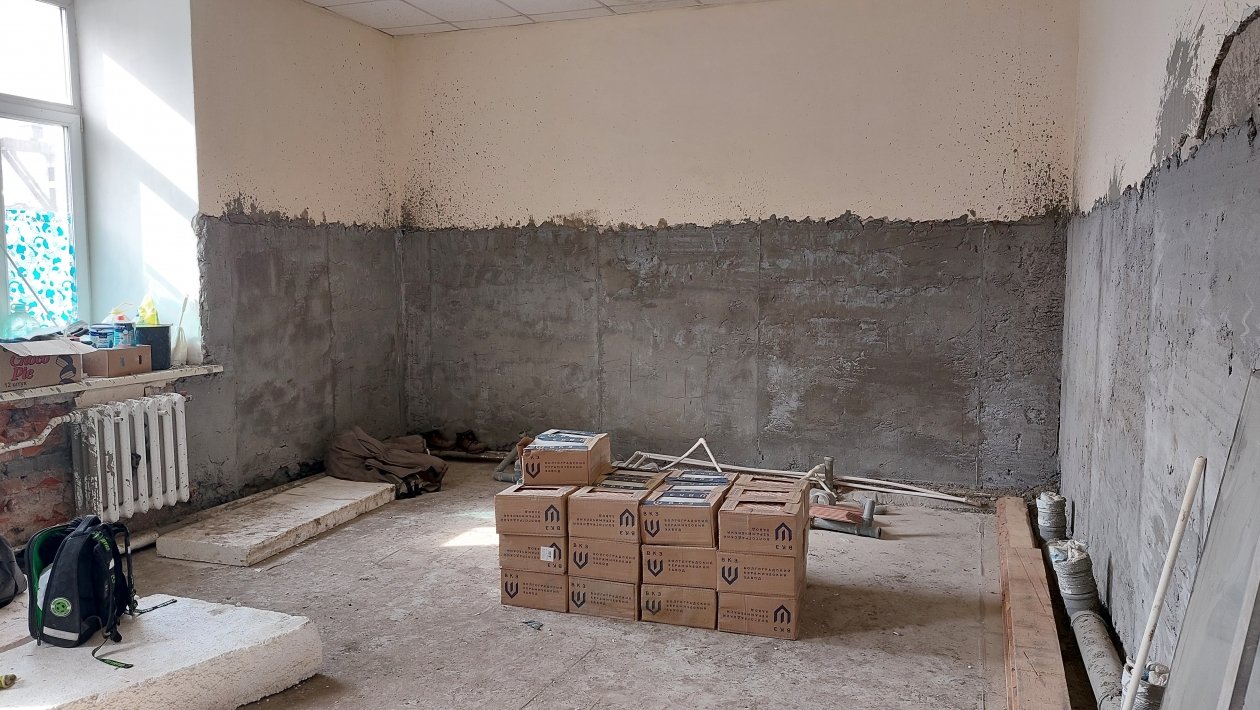"Выполняем укрепление цокольного перекрытия, замену и утепление полов, а также устанавливаем дренажную систему. После утепления полов, сверху установим фанеру и положим линолеум. Рембалку мы полностью поменяли и сейчас закрываем. Туалет полностью разобрали, штукатурили стяжку, двери поменяем, всё будет новое", — рассказал представитель подрядчика.