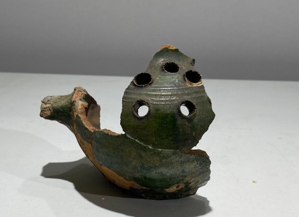 Среди тысяч находок загадкой стали зелёные керамические черепки, часть которых имела сквозные отверстия диаметром около 1 см. Исследователи не могли понять фрагментами какого сосуда они являлись: ни чашка, ни чайник", — отмечают в музее.