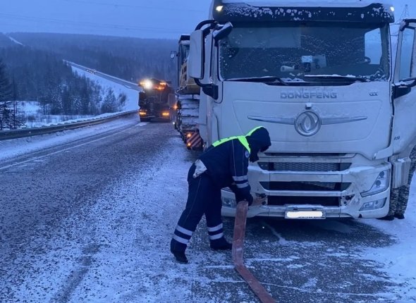 YakutiaMedia, 19 января. В 40-градусный мороз на федеральной трассе "Лена" сотрудники Госавтоинспекции Нерюнгринского района оказали помощь водителю грузовика из Ростовской области. Мужчина вез тяжелый груз из Якутска в Амурскую область, когда у его автомобиля сломался редуктор моста. Транспортное средство было вынуждено остановиться на встречной полосе, полностью перекрыв проезд, сообщает пресс-служба ГАИ Якутии.