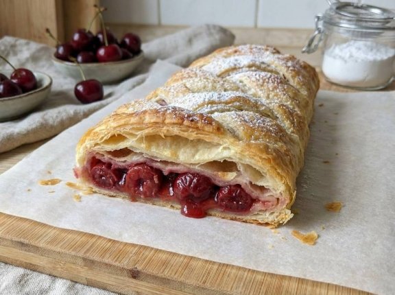 При запекании слоеное тесто становится слоистым и румяным, внутри остается насыщенная кисло‑сладкая вишневая начинка. Такой рулет подают как простой домашний пирог к чаю или кофе.