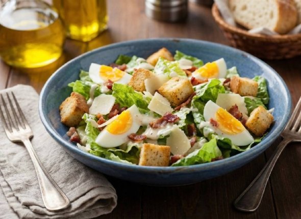5. Перед подачей выложить сверху яйца, посыпать салат сухариками и украсить зеленью.