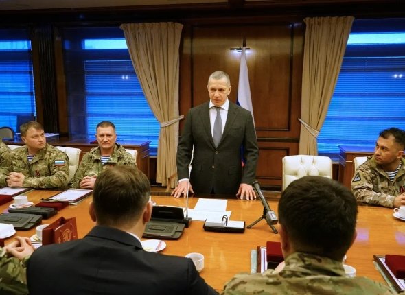 На встрече Трутнев вручил бойцам медали Минобороны РФ и благодарственные письма. В ответ они подарили ему флаг, подписанный всеми участниками встречи.