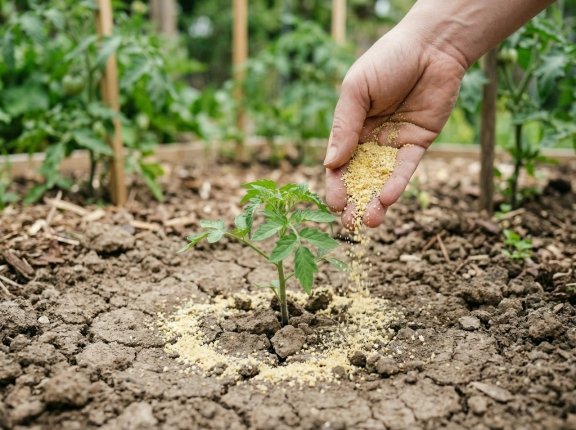 Следующий компонент — рыбная мука. Она обогащает почву фосфором, азотом, кальцием и микроэлементами, а действует постепенно по мере разложения. Норма — 1 столовая ложка на лунку. При отсутствии рыбной муки подойдёт костная или мелкая рыба, 3–4 штуки на посадку.