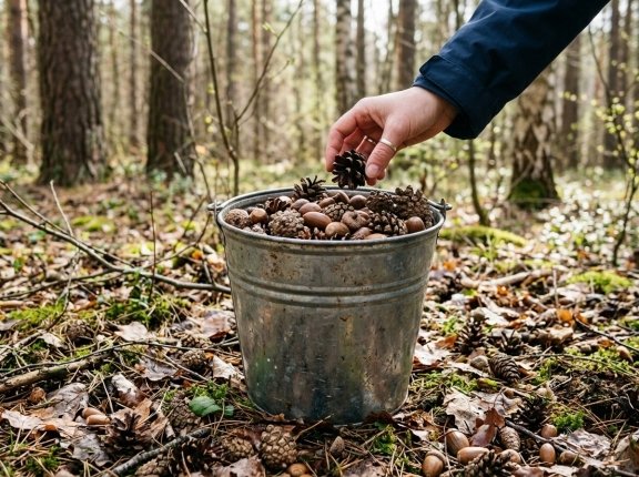 Для урожайного сезона хватит мешка шишек и желудей. Эти природные материалы делают землю плодороднее, растения крепче, а участок аккуратным.