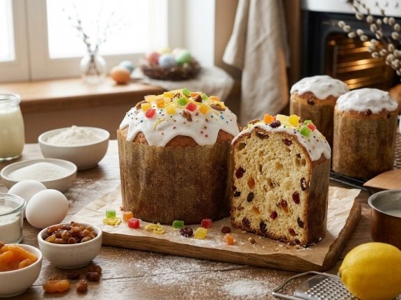 На замес теста уйдёт около 15 минут, а выпекание займёт примерно полчаса. Куличи получаются воздушными, мягкими и немного влажными внутри. В качестве наполнителя подойдут любые добавки. Глазурь можно выбрать по вкусу — сахарную, шоколадную или лимонную.