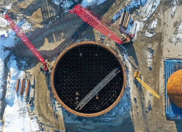 Сегодня все трубы установлены в проектное положение, высота каждой превышает 10 метров. Высокая плотность свайного поля обусловлена как расчётными нагрузками, так и сложными характеристиками грунтов. Через направляющие трубы будет выполняться устройство буронабивных свай (БНС) в основание пилона на дне реки. Строители также приступили к монтажу двух папильонажных рам, предназначенных для размещения лебёдочного оборудования, с помощью которого будет обеспечиваться позиционирование коффердама в русле.