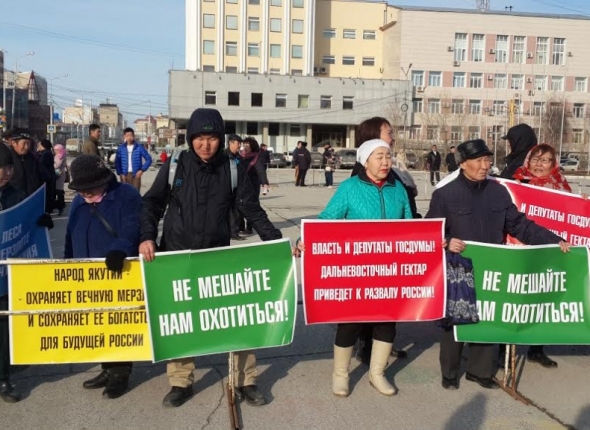 YakutiaMedia, 18 апреля 2016. Якутяне вышли на пикет против включения республики в закон о бесплатной раздаче земель на Дальнем Востоке. Мероприятие прошло на главной республиканской площади, перед домом правительства. Напомним, что ранее неравнодушные жители столицы выходили на митинг с просьбой провести референдум и учесть их права, интересы. Тогда мероприятие прошло на площади Дружбы и собрало порядка 200 человек, сообщает ИА YakutaMedia.